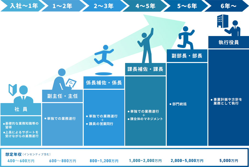 年4回の査定と毎⽉のインセンティブによって、個々の成果を迅速に反映させます。未経験からでも早期に⾼収⼊を⽬指せる環境です。